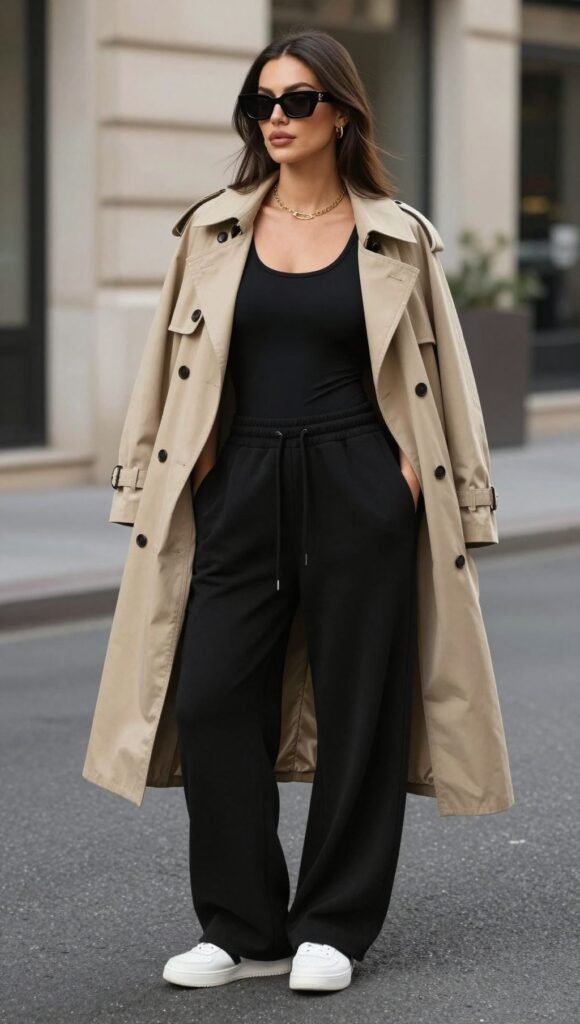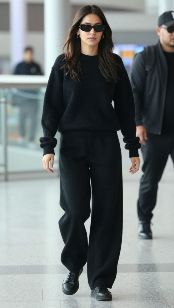 Elevate the sweats with a black cashmere crewneck for a sleek head-to-toe vibe. Add minimal gold hoops and leather sneakers to keep it clean. Think “airport celeb trying not to be noticed.”