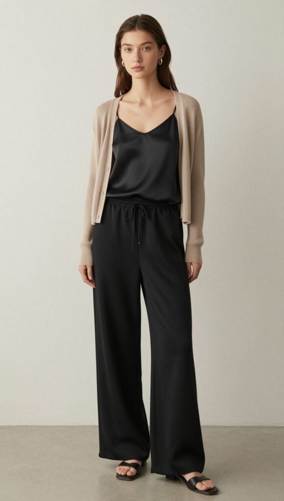 Layer a silk cami with a fine-knit cardigan for soft luxe. Add dainty earrings and mules.