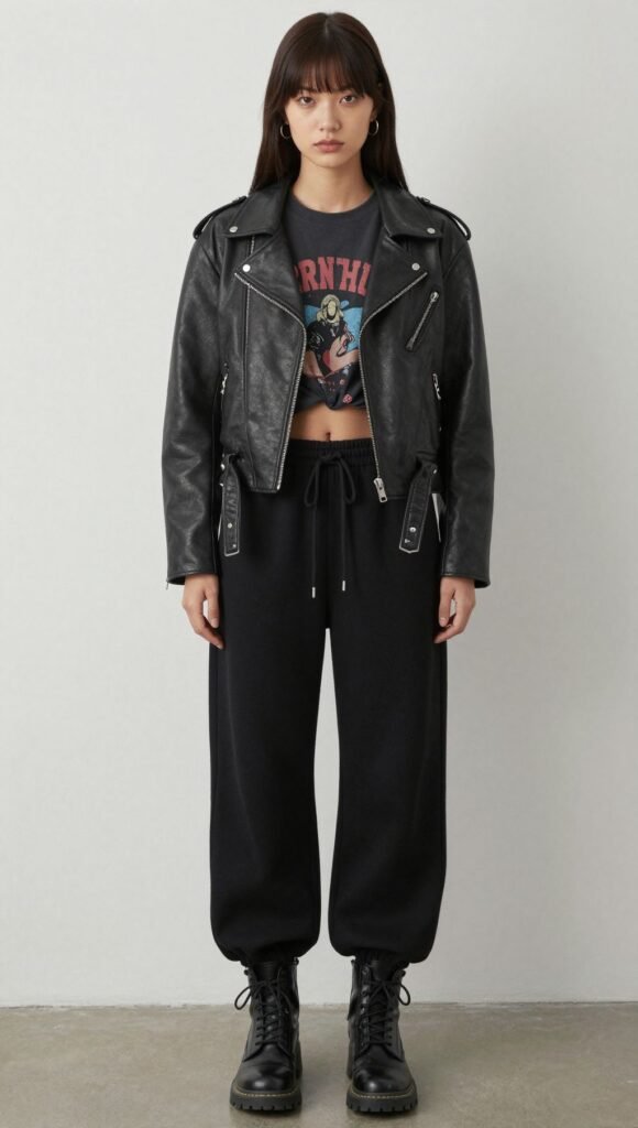 Go edgy with a vintage graphic tee under a leather moto jacket. Finish with combat boots for bite.