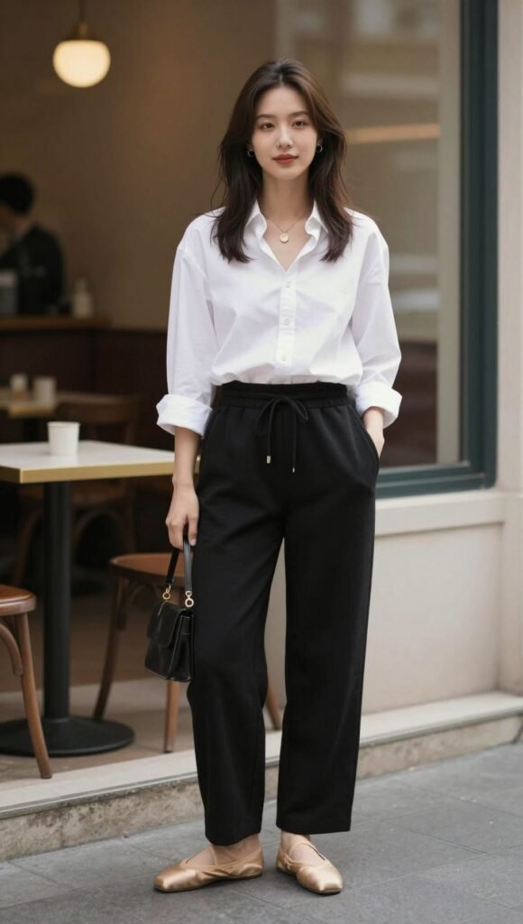 Try a crisp white button-down loosely tucked with ballet flats. It’s giving effortless Paris coffee run.
