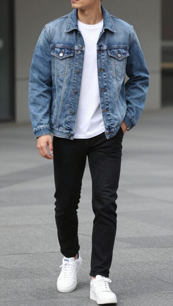 Simple, clean, and never fails. A white tee plus slim black or indigo jeans under your denim jacket is the cheat code for instant cool.