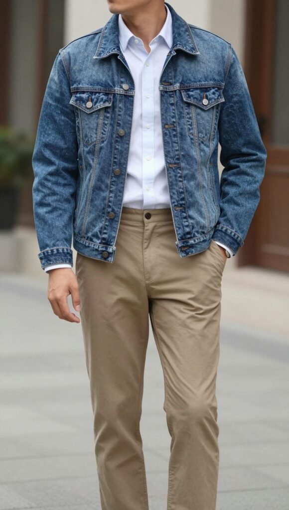Smart casual without the suit. A Oxford shirt and chinos under your denim jacket hits that weekday-to-weekend sweet spot.