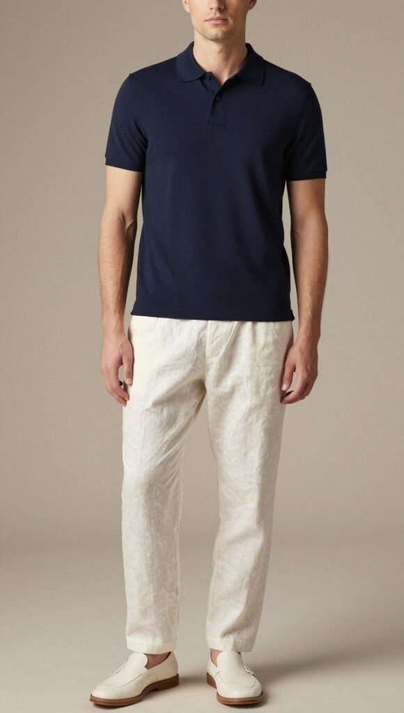 Polo energy without golf dad energy. A fitted navy polo sharpens the softness of off-white linen pants.