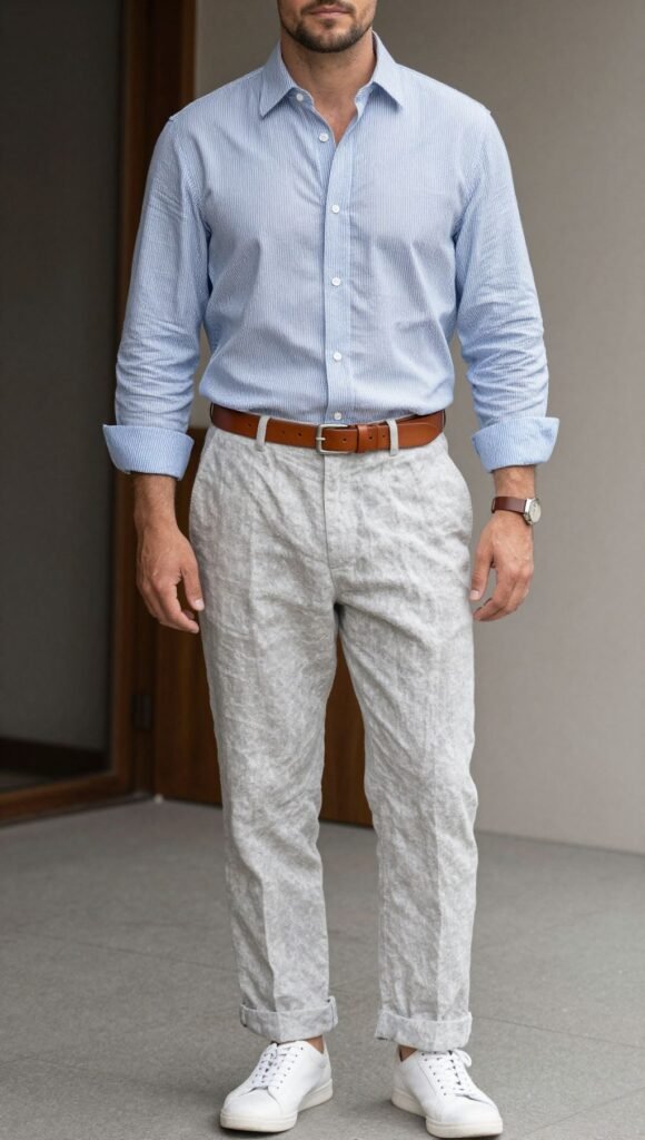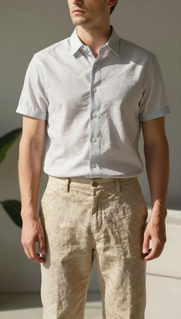 Office casual if your office likes sunlight. A short-sleeve button-up with tan linen pants looks tidy and breathable.
