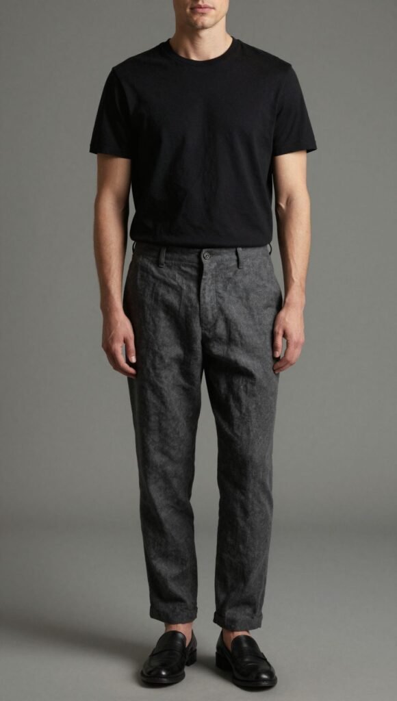 Monochrome, moody, and low effort. A black tee with charcoal linen pants looks tailored even when it’s not.
