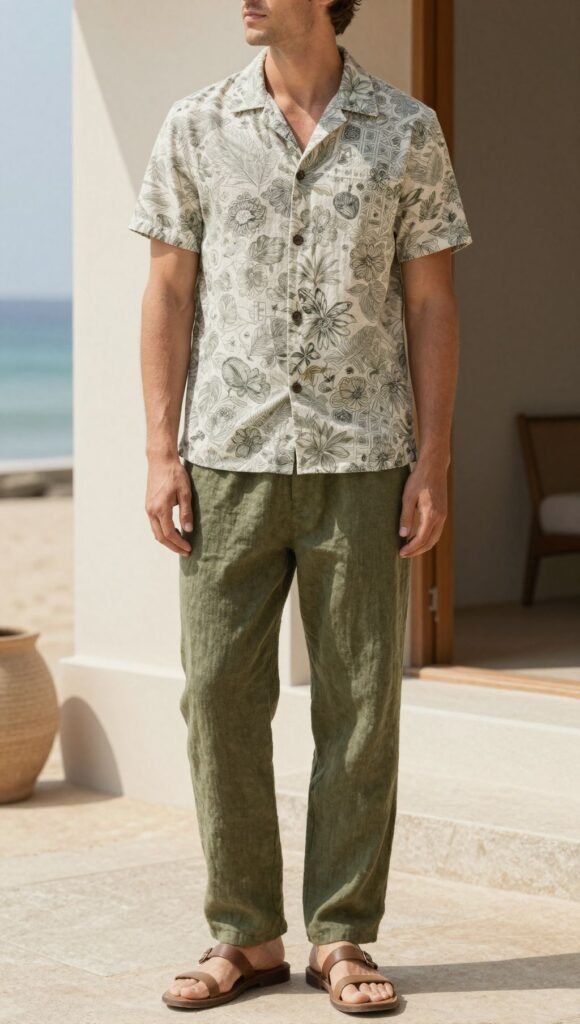 Retro lean, modern fit. A breezy camp collar shirt with olive linen pants screams coastal afternoon.