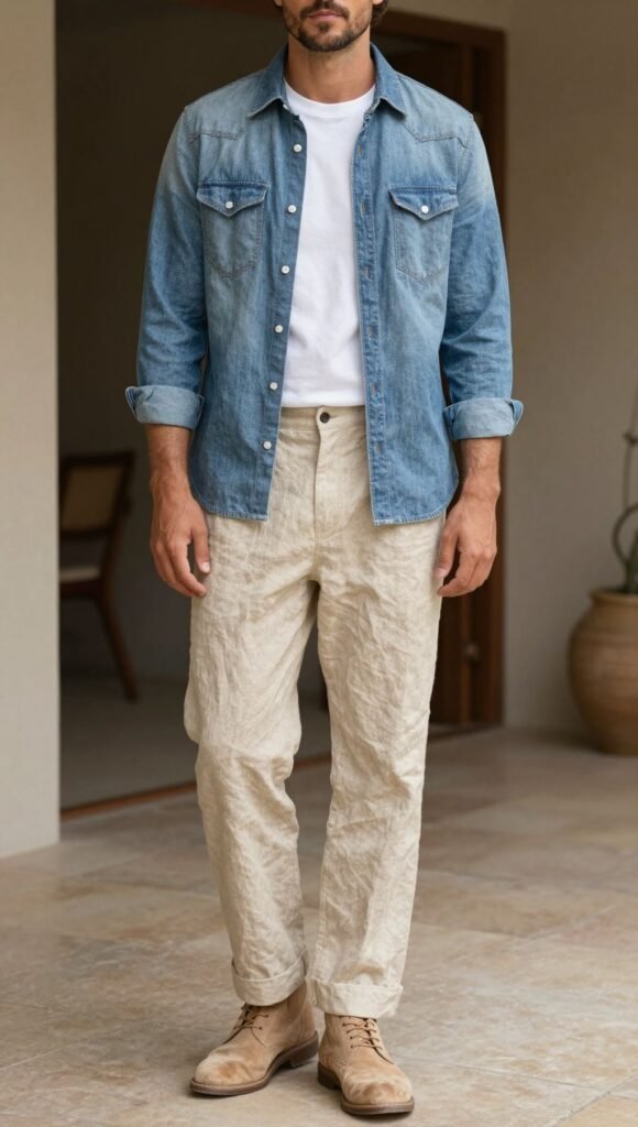 Rugged meets resort. A light denim shirt with beige linen pants turns casual into composed.