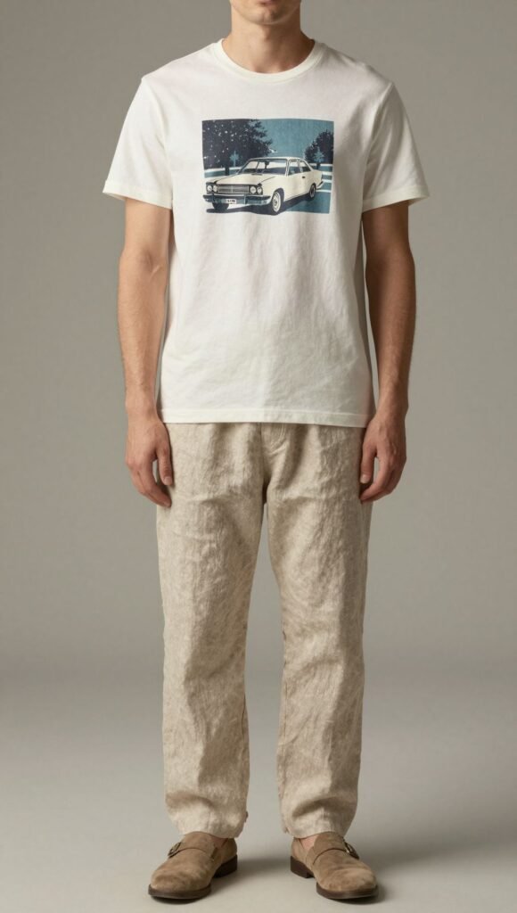 A little personality never hurt. A clean graphic tee with natural linen pants keeps it fun but not loud.
