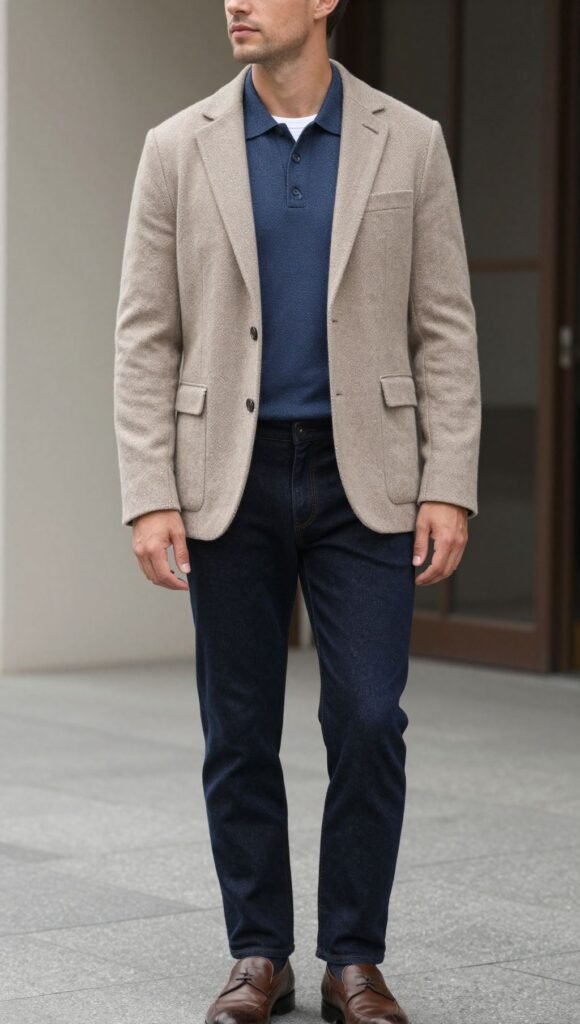 The blazer adds shape while denim keeps it casual-cool.
