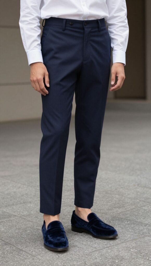 Footwear flex. Pair velvet loafers with a minimal outfit—think white shirt and navy trousers.