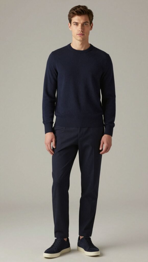 One color head to toe. A navy knit, navy trousers, and navy sneakers look effortlessly luxe.