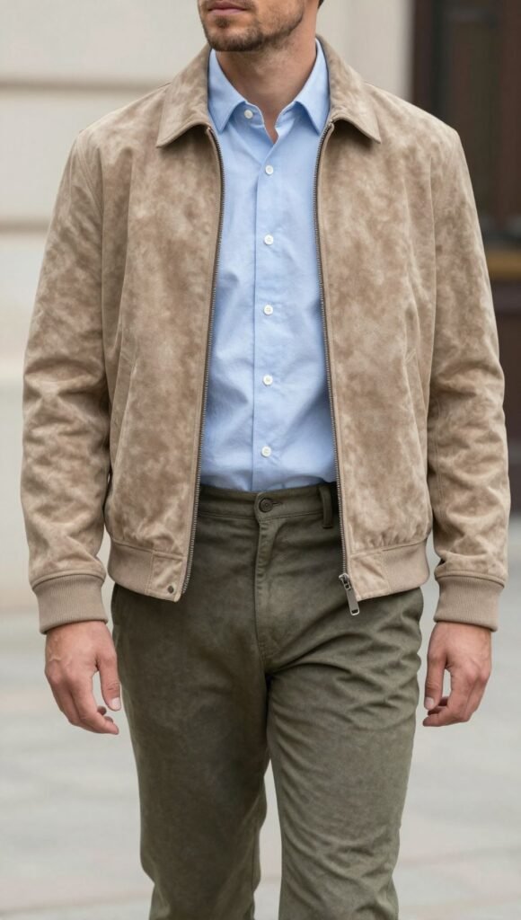 Prep meets edge. A light blue oxford under a suede bomber with tapered trousers balances dressy and relaxed.