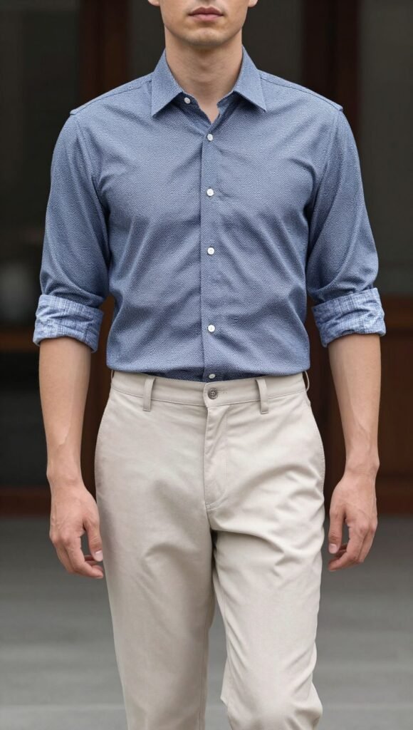 Roll sleeves neatly for casual flair. Skip loud shoes to avoid overload.