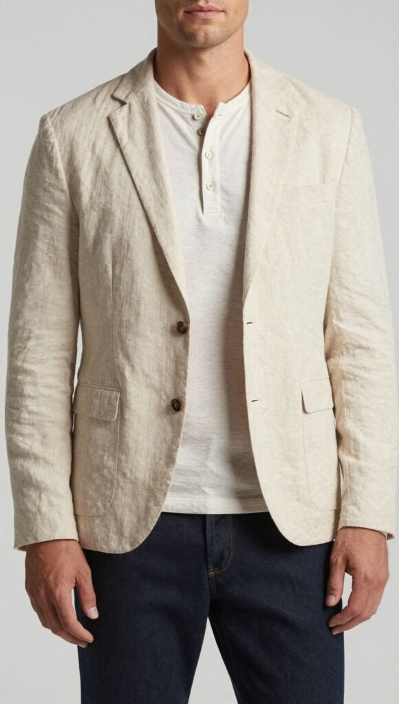 Rugged meets refined. A long-sleeve henley under a linen-cotton blazer pairs well with chinos or jeans.