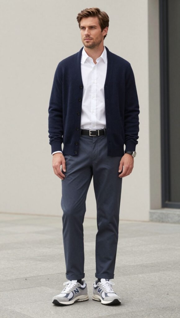 Comfort plus neat details reads confident.