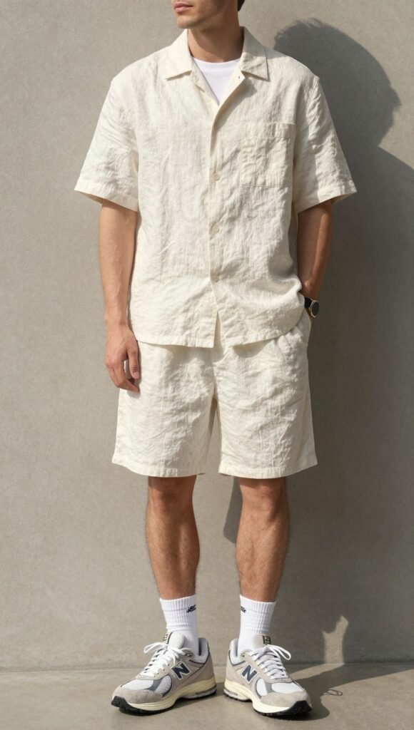 Beat the heat, keep the drip. Go boxy linen shirt, 5-inch shorts, and low socks. The 2002R adds structure.