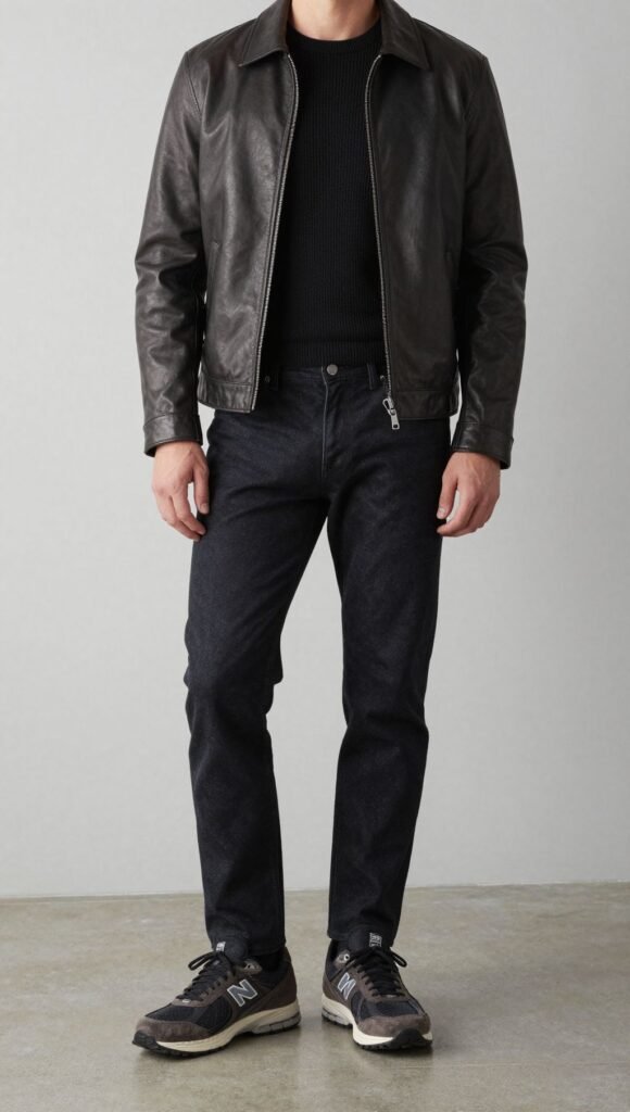 Understated and sharp. Try a black knit tee, dark tapered denim, and a leather jacket. The 2002R keeps it slick without dress shoes.