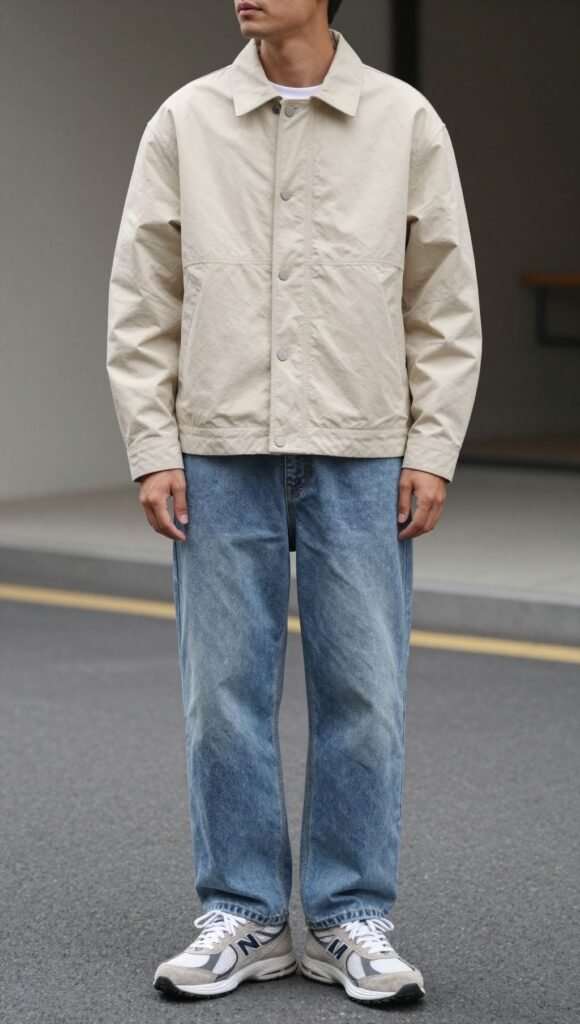 Embrace the dad-core agenda. Go with a beige chore jacket, relaxed jeans, and white socks peeking. The 2002R finishes it off with that quiet flex.
