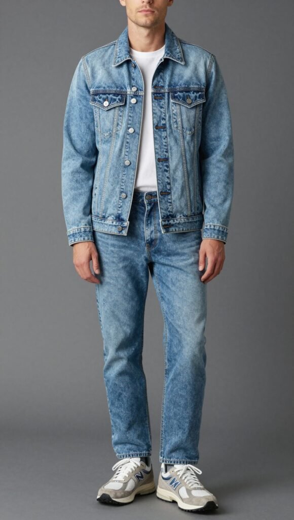 Yes, the Canadian tuxedo—but cooler. A light-wash jacket with mid-wash jeans and your 2002R hits that balanced casual.
