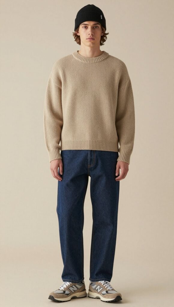 Pair a chunky crewneck sweater with straight-leg denim and your 9060. Add a beanie if your hair’s plotting chaos.