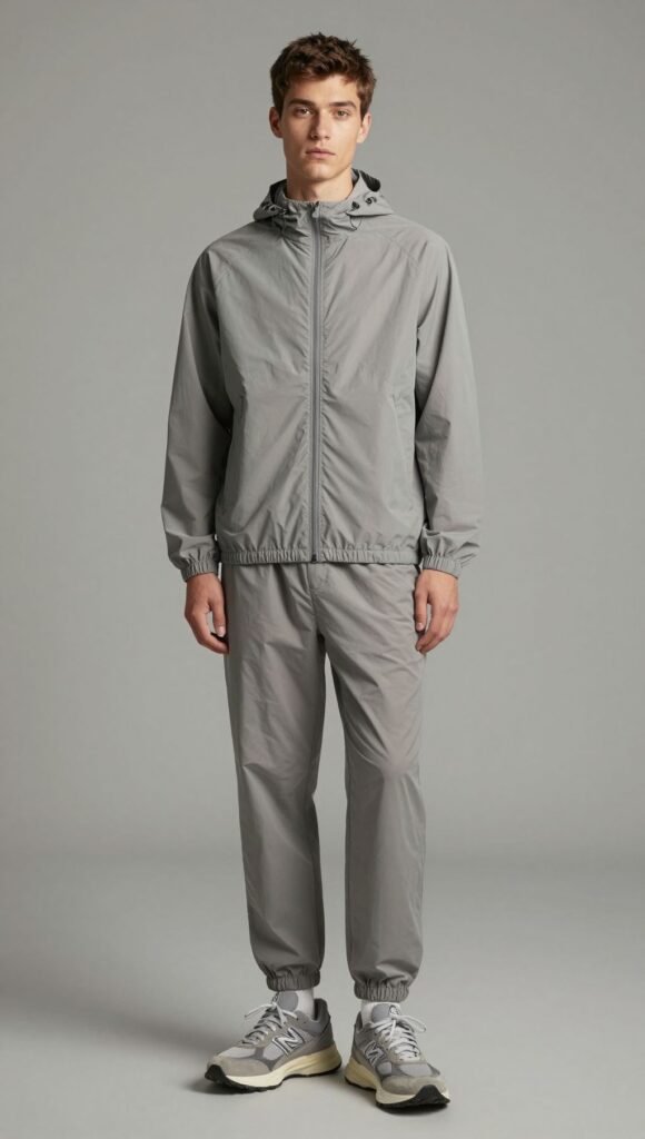 Run with nylon pants, a lightweight windbreaker, and grey 9060. It’s gym-adjacent, not gym class.