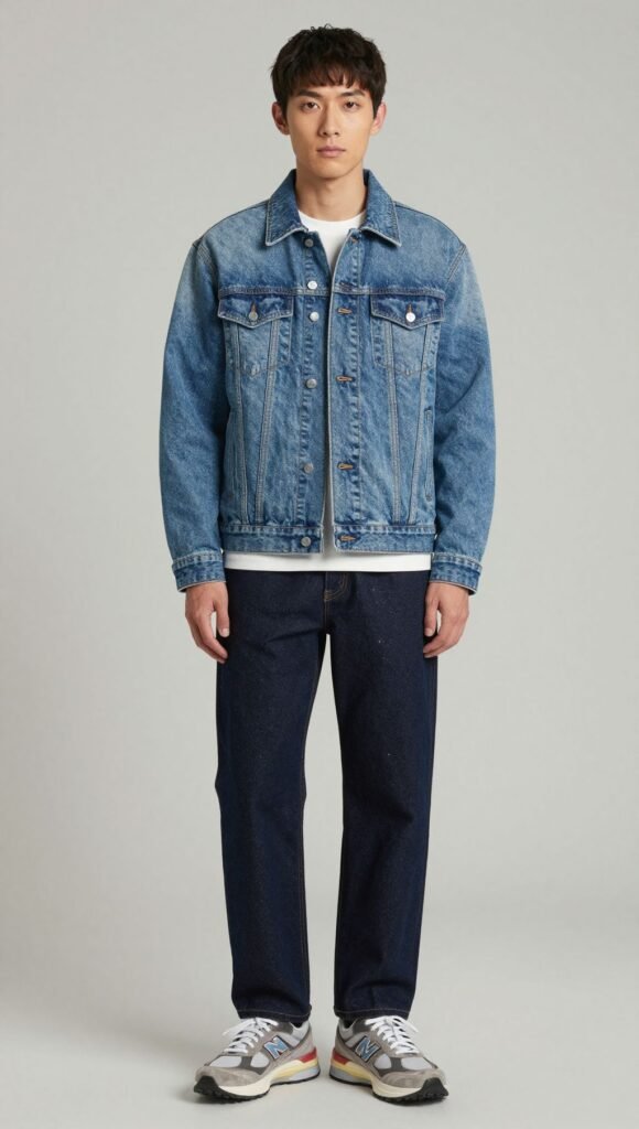 Go full double denim with a mid-wash jacket and dark jeans. Anchor with contrasting 9060 for a crisp break.