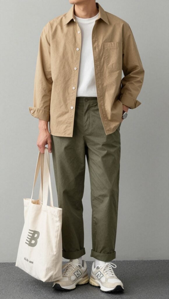 Stack olive chinos, a tan overshirt, and cream 9060. Add a tote and pretend your errand list is a vibe.