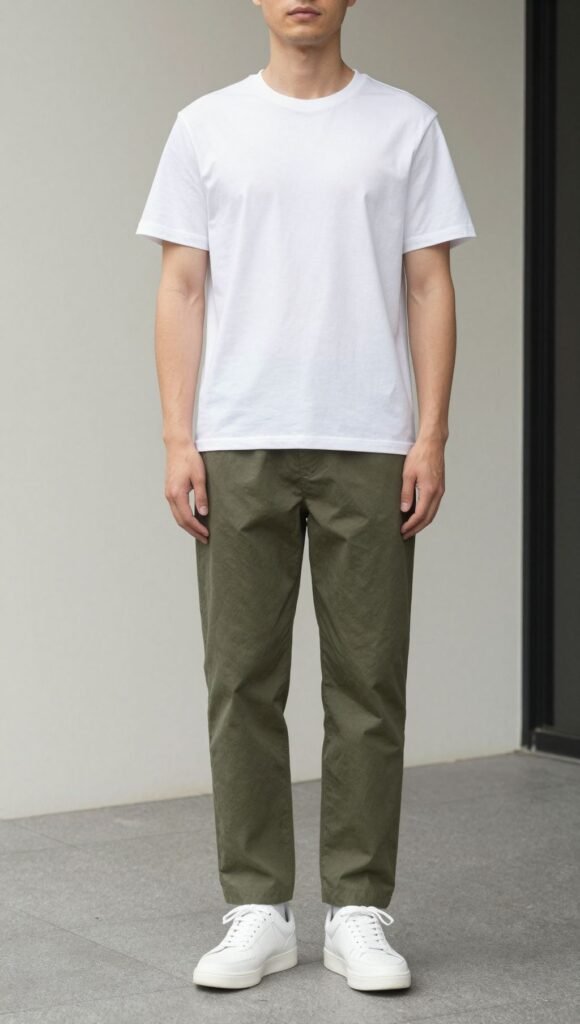 Simple, sharp, undefeated. A crisp white tee with minimal white sneakers lets the olive do the talking.