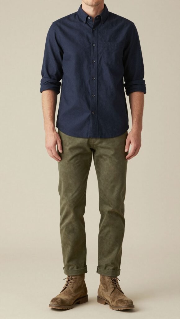 Navy and olive are best friends. A navy Oxford shirt plus suede desert boots feels smart without trying.