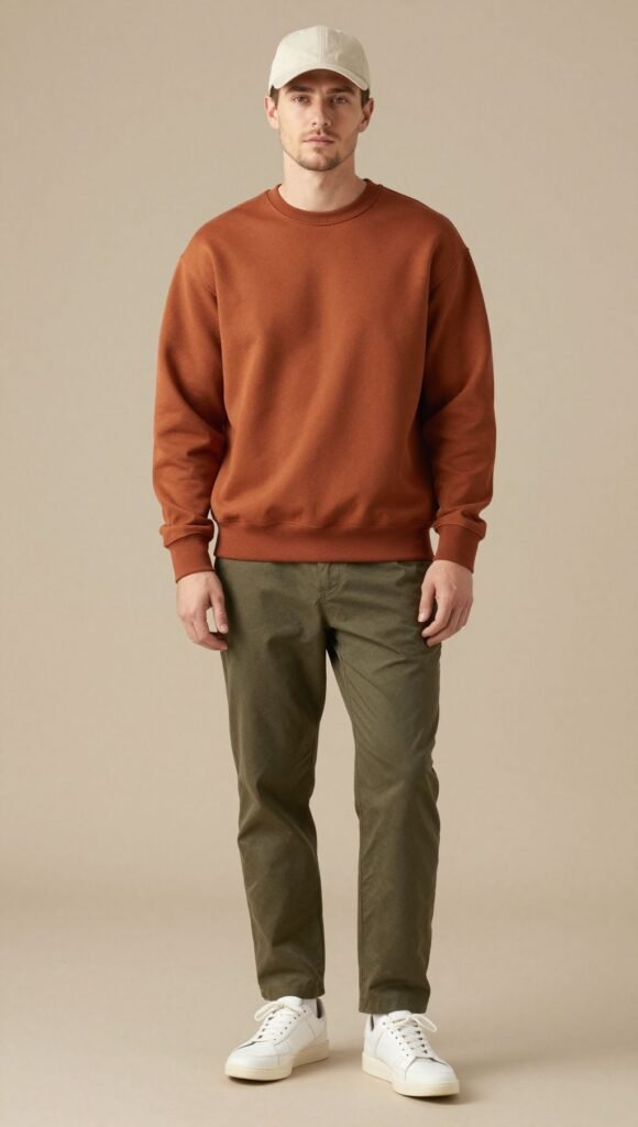 Warm tones for the win. A rust or burnt orange sweatshirt pairs beautifully with olive.
