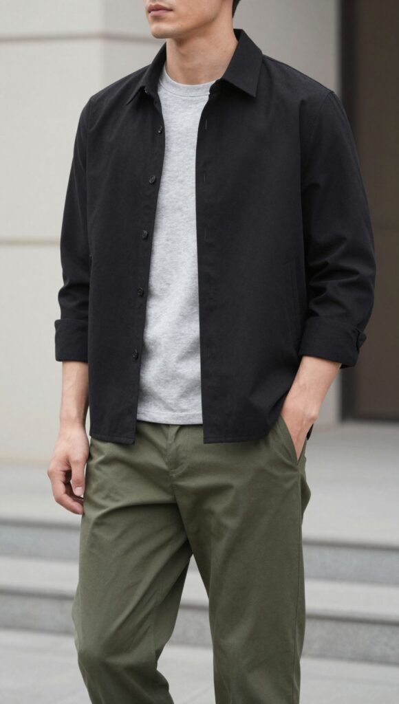 Effortless layering. A light grey tee under a black overshirt with olive pants is plug-and-play.