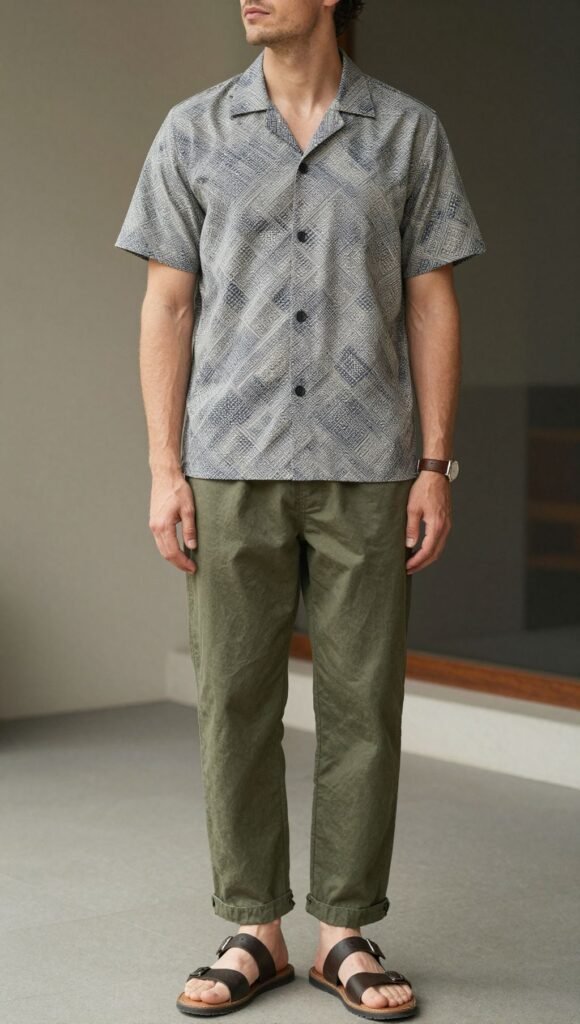 Vacation-core, city approved. A camp collar shirt with a subtle print and leather sandals screams relaxed.