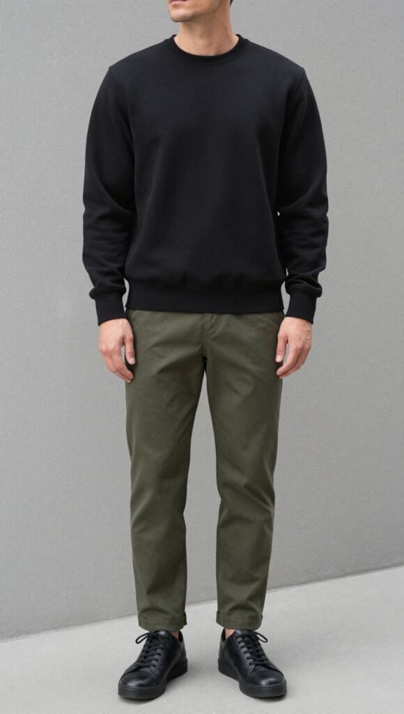All-business up top, cool off-duty below. A black crewneck sweatshirt with black leather sneakers anchors the olive.