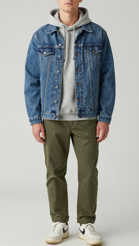 Weekend uniform unlocked. A grey hoodie under a mid-wash denim jacket balances casual and crisp.