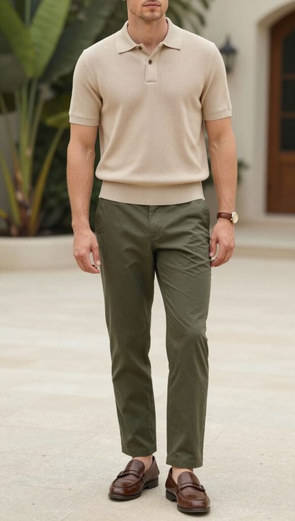 Smart-casual with vacation energy. A beige or sand knit polo plus brown loafers is chef’s kiss.