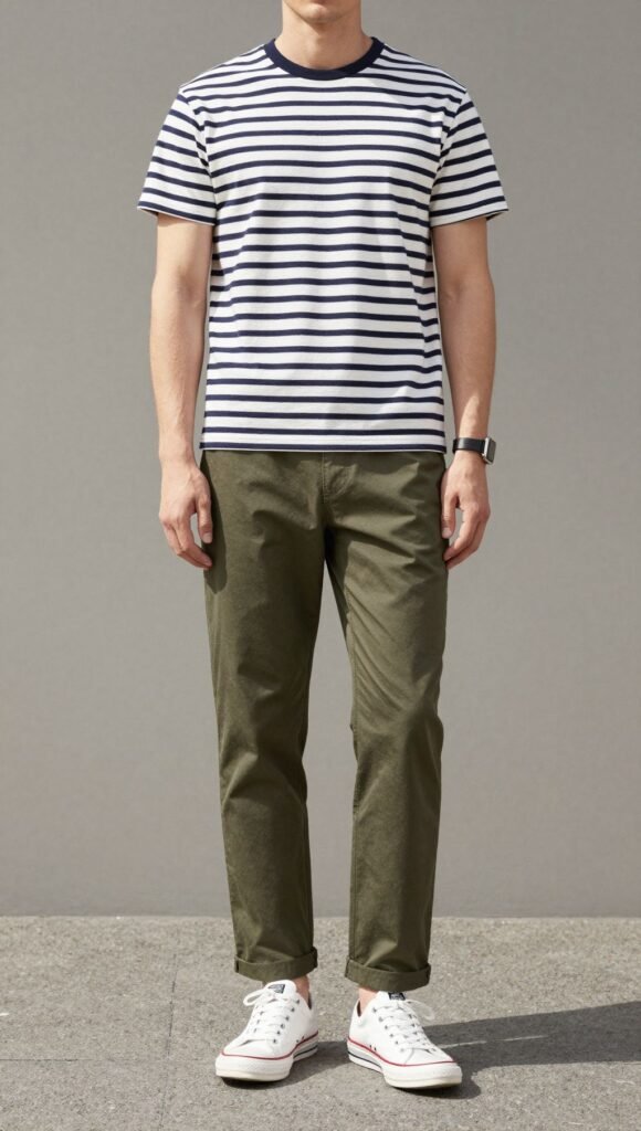 French-lite, easy to wear. A navy-and-white striped tee with white canvas sneakers gives instant style.