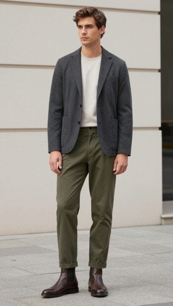 Date-night upgrade. A charcoal or dark grey blazer with brown Chelsea boots turns olive into dressy-chill.