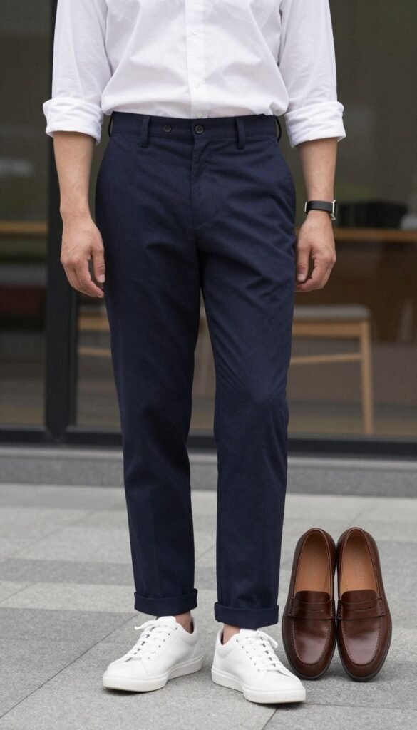 - Pairs with white sneakers or brown loafers.
