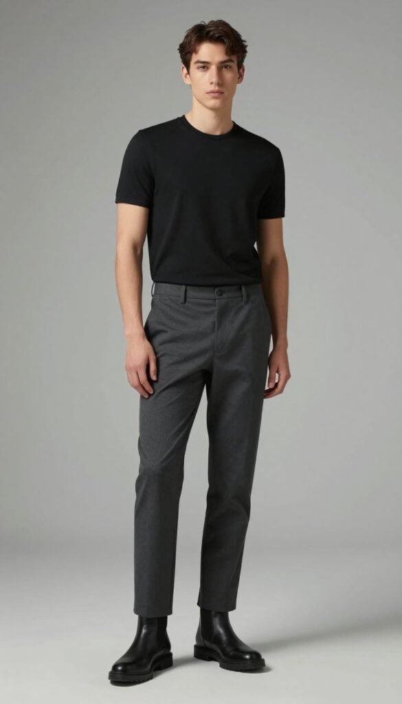 2. Black T-Shirt + Charcoal Trousers