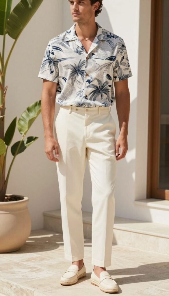 9. Patterned Cuban Collar Shirt + Cream Pants