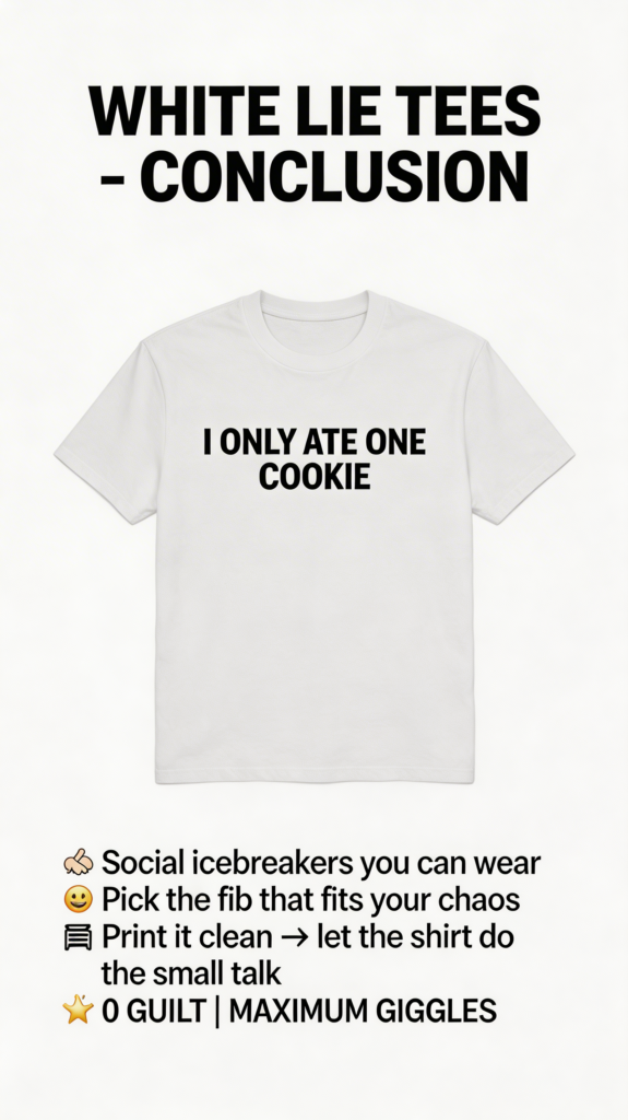 Need a harmless fib that makes people snort-laugh? Slap it on a tee. These white-lie gems are chaotic-good, easy to read, and perfect for parties, pics, and pretending you have your life together.